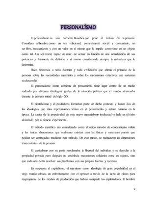 El documento presenta una introducción a la filosofía, destacando que ayuda a entender al ser humano. Luego resume las corrientes del personalismo, la epistemología y otros temas filosóficos. El personalismo enfatiza a la persona como un ser social, libre y con valor propio. Emmanuel Mounier fue su principal representante, afirmando que la persona crece purificándose del individuo. El documento también analiza el marxismo, fascismo y otros "ismos" desde la perspectiva del personalismo.