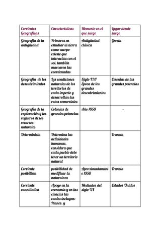 Este documento describe las diferentes corrientes geográficas que han surgido a lo largo de la historia, incluyendo su momento de surgimiento y lugar de origen. La geografía de la antigüedad surgió en Grecia y estudió la Tierra como un cuerpo celeste. La geografía de los descubrimientos surgió en el siglo XVI durante la época de colonización. La corriente determinista surgió en Francia en 1850 y consideraba que el medio ambiente determina las actividades humanas.
