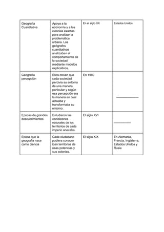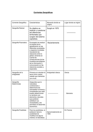 El documento describe diferentes corrientes geográficas, incluyendo su objetivo, momento de origen y lugar de origen. La geografía radical surgió en 1970 para explicar y cuestionar las diferencias territoriales del capitalismo. La geografía posmoderna analiza el impacto de la globalización en diferentes sociedades. La geografía de la antigüedad estudió la tierra como un cuerpo celeste que interactúa con el sol y surgió en la antigua Grecia.