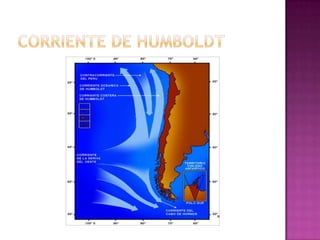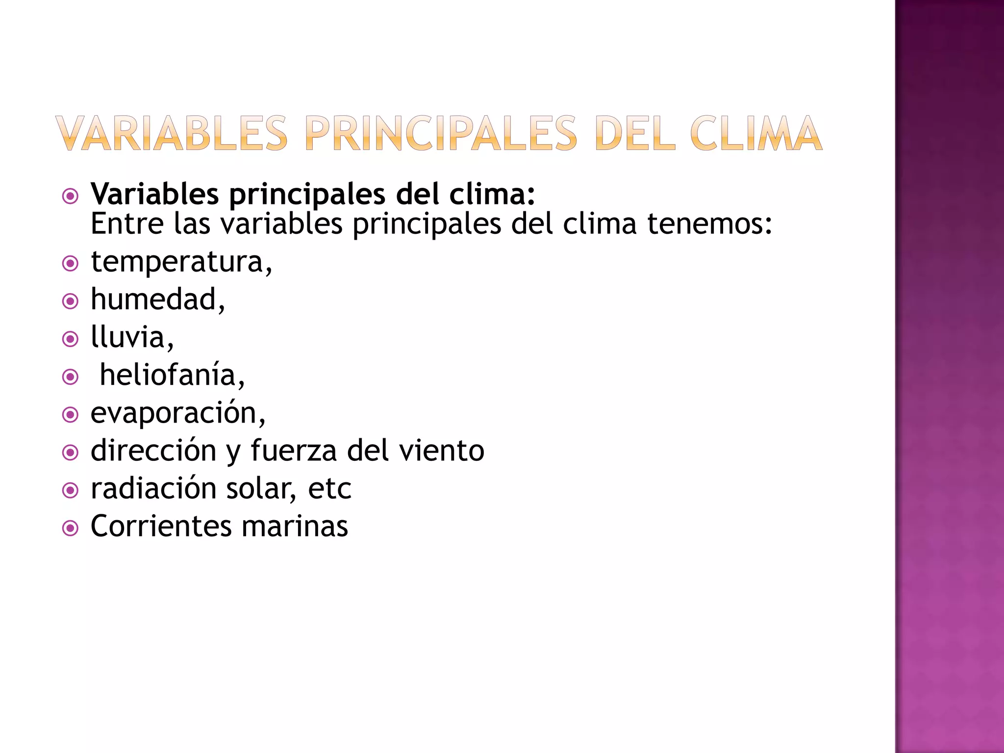 Las variables principales del clima incluyen la temperatura, humedad, lluvia, radiación solar y viento. La corriente de Humboldt es una corriente fría descubierta frente a las costas de Sudamérica, mientras que El Niño es un fenómeno oceánico-atmosférico que calienta las aguas del Pacífico y causa lluvias torrenciales en algunas regiones. Las corrientes marinas, como la corriente de Humboldt y El Niño, influyen en el clima de las regiones costeras.