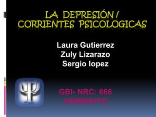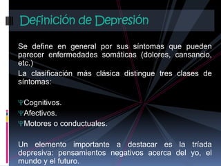 El documento describe las principales teorías y tratamientos de la depresión desde una perspectiva psicológica. Define la depresión y sus síntomas, y explica las teorías conductual y cognitiva sobre sus causas. Finalmente, detalla los tratamientos cognitivo-conductuales, que se enfocan en identificar y modificar pensamientos distorsionados a través de técnicas conductuales y cognitivas.