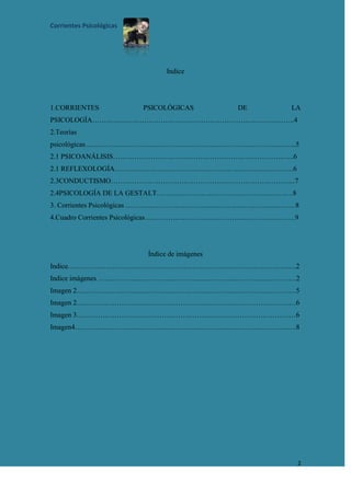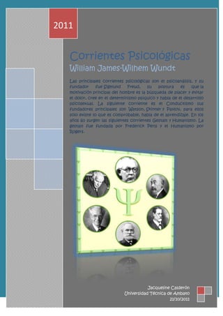 El documento resume las principales corrientes psicológicas como el psicoanálisis fundado por Sigmund Freud, el conductismo fundado por Watson, Pavlov y Skinner, y la psicología de la Gestalt fundada por Frederick Perls. También menciona que en los años 60 surgieron las corrientes del humanismo fundada por Rogers.