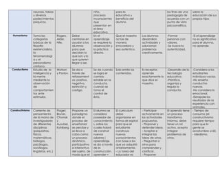 El documento presenta un análisis comparativo de diferentes corrientes psicológicas en educación, incluyendo el descubrimiento por observación, psicoanálisis, humanismo, conductismo y constructivismo, resaltando sus enfoques, ventajas y desventajas. Se describen las etapas de desarrollo educativo según Rousseau, Freud y características de métodos pedagógicos como Montessori y Freinet. Además, se abordan posturas sobre la enseñanza de autores como Rogers y las etapas de desarrollo moral de Kohlberg.