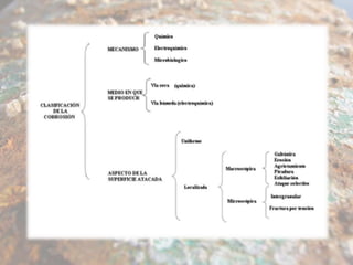 El documento trata sobre la corrosión. Define la corrosión como el deterioro de un material debido a un ataque electroquímico por su entorno. Explica que la corrosión ocurre cuando los materiales, especialmente los metálicos, tienden a estabilizarse químicamente después de ser extraídos de la tierra. También discute que la corrosión es un problema industrial importante que causa accidentes y representa un alto costo económico.