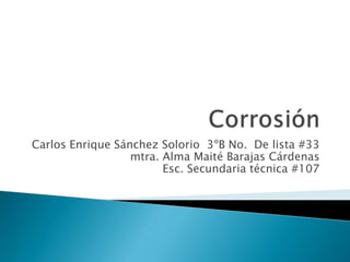 La corrosión es un proceso electroquímico en el cual un metal reacciona con su medio ambiente para formar óxido o algún otro compuesto. Este proceso está compuesto por un ánodo, un cátodo y un electrolito. En el ánodo, el metal es corroído al pasar a través del electrolito como iones cargados positivamente, liberando electrones que participan en la reacción catódica. La corrosión electroquímica implica el paso simultáneo de electrones entre los espacios anódicos y catódicos,
