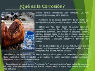 La corrosión es un proceso natural en el cual los metales y aleaciones devuelven a sus formas más estables a través de una transformación a un compuesto de óxido. No solo afecta materiales metálicos, también afecta cerámicos y polímeros. Existe en varias formas como corrosión atmosférica, galvánica, por erosión, grietas de corrosión por tensión, por picadura, bacteriana, química y depende de factores como la composición química del agua y la instalación.