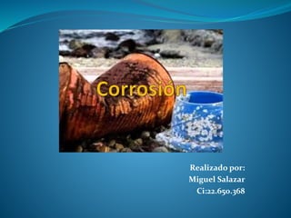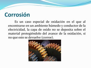El documento describe los diferentes tipos de corrosión, incluyendo la corrosión uniforme, galvánica, por picaduras e intergranular. Explica que la corrosión es un tipo especial de oxidación que ocurre en ambientes húmedos y conductores eléctricos. También cubre métodos para prevenir la corrosión como recubrimientos, capas químicas, protección catódica e inhibidores.