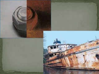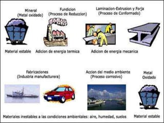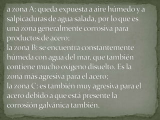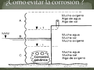 La corrosión es la interacción de un metal con su medio ambiente, causando deterioro en sus propiedades físicas y químicas a través de reacciones de oxidación-reducción. Esta ocurre cuando hay presencia de un electrólito, creando regiones anódicas donde el metal se disuelve y regiones catódicas donde el metal es inmune. La velocidad de corrosión depende del ambiente y factores como agua, sal y oxígeno aceleran el proceso, mientras que diferentes metales tienen distintas resistencias a la corro