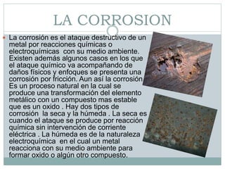 Este documento trata sobre la corrosión. Explica que la corrosión es el ataque químico o electroquímico de un metal por su medio ambiente, resultando en su degradación. Describe dos tipos de corrosión: la seca por reacción química y la húmeda por reacción electroquímica. Además, detalla diversos tipos de corrosión como la galvánica, por picadura y uniforme. Finalmente, presenta métodos para prevenir la corrosión como protección catódica, recubrim