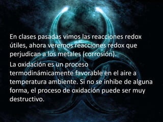 Este documento discute la corrosión de metales como el aluminio y el hierro. Explica que el aluminio se oxida lentamente debido a la formación de una capa protectora de óxido de aluminio que impide la penetración de oxígeno y agua. En el caso del hierro, la oxidación requiere oxígeno y agua, y factores como el pH y las sales aceleran el proceso de corrosión, formando la herrumbre. También menciona que para proteger la Torre Eiffel de la corrosión se aplican 50 ton