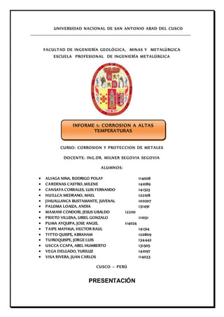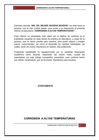 El informe de laboratorio examina la corrosión a altas temperaturas, destacando la interacción química entre metales y gases agresivos, como el oxígeno. Se analizan mecanismos de formación de óxidos, los efectos de la temperatura y la importancia de la relación de Pilling-Bedworth para determinar la protectibilidad de los óxidos formados. El objetivo es obtener óxidos metálicos a diferentes temperaturas y tiempos, proporcionando un contexto teórico y práctico para la comprensión de la corrosión química.