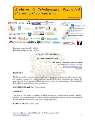 El documento aborda la corrupción pública, definiéndola como un fenómeno multidimensional que afecta diversas áreas de la sociedad mexicana y analizando sus variadas clasificaciones y formas de expresión. Además, revisa el marco legal y las instituciones encargadas de combatir la corrupción en México, resaltando la importancia de factores éticos y morales en la lucha contra este problema. Concluye que la corrupción no siempre es un delito penal, destacando la complejidad de su naturaleza y sus diversas manifestaciones en la práctica.