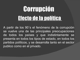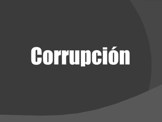 La corrupción se ha convertido en una preocupación global y afecta a todos los países y sectores de la sociedad. Se define como el abuso del poder público en beneficio privado o la desviación de funcionarios públicos de las normas para fines privados. La corrupción política es un mecanismo mediante el cual los partidos enfrentan los altos costos de campaña, comprometiendo futuros gobiernos. Además, la corrupción es un fenómeno complejo que requiere un enfoque multidisciplinario para comprenderlo y reducirlo, pues vulner
