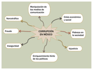 La corrupción en México se manifiesta a través de la manipulación de los medios de comunicación, el enriquecimiento ilícito de los políticos, y la inseguridad y la injusticia que resultan de la pobreza, la crisis económica y social, y el narcotráfico.