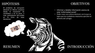 El documento analiza la corrupción electoral en México, señalando que comienza con la imposición de candidatos sin participación ciudadana. Identifica como causas la naturaleza humana, el exceso de poder, y factores económicos y culturales. Además, encuentra que los mexicanos tienen poco interés y conocimiento sobre el proceso político, lo que genera desconfianza, conformismo y apatía.