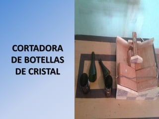 Este documento describe un proyecto para construir una cortadora de botellas de vidrio. Los estudiantes consumían demasiados refrescos embotellados y vasos de unicel, lo que causaba problemas ambientales. Se propuso que los estudiantes trajeran tazas de casa o hicieran sus propios vasos cortando botellas, pero necesitaban una forma segura de cortar el vidrio. El documento analiza varias alternativas y propone diseñar una cortadora de botellas de madera con ladrillos y resistencias calentadas para cortar el vidrio