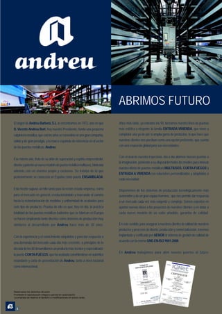El documento describe las características de varios modelos de puertas cortafuegos fabricadas por Andreu Barberá, S.L., incluyendo las líneas Delta, Turia, Turia Premium, Fono-Turia y Sigma. Se detallan las especificaciones técnicas de cada modelo, como materiales, clasificaciones de resistencia al fuego, sistemas de bisagras, cerraduras y accionamiento. El documento también proporciona medidas estándar y opciones de accesorios para las puertas.