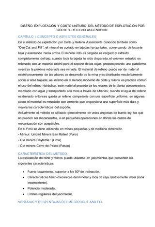 El documento describe el método de explotación minera conocido como corte y relleno ascendente. Este método implica la extracción del mineral en franjas horizontales comenzando desde la parte inferior de la mina y avanzando verticalmente. Una vez extraído el mineral de una franja, el espacio vacío es rellenado con material estéril para soportar las paredes y techo de la mina.