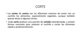 Este documento describe diferentes técnicas de corte de alimentos utilizadas en cocina. Explica los agarres y movimientos correctos del cuchillo y define varios tipos de cortes como juliana, brunoise, mirepoix, paisana, chiffonade, rondelle, sifflets, emincé, battonet, cascos y concassé.