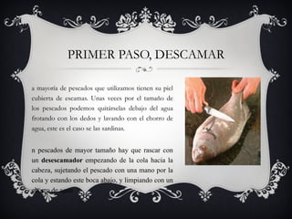 El documento describe los pasos básicos para limpiar y cortar pescados. Primero se descama el pescado, luego se le extraen las vísceras mediante eviscerado, ya sea apretando el vientre o abriéndolo con tijeras. Finalmente, el pescado se puede cortar de diferentes formas como en filetes, cubos, tiras o rodajas, dependiendo del plato que se vaya a preparar.