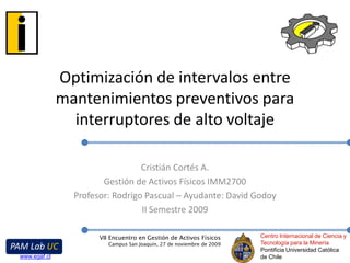 Este documento resume un estudio para optimizar los intervalos entre mantenimientos preventivos para interruptores de alto voltaje. El objetivo general fue minimizar la indisponibilidad durante la madurez e incrementar la confiabilidad durante la vejez variando los intervalos. Los resultados mostraron que cambiando el intervalo entre 3 a 7 años se podía disminuir la indisponibilidad en la madurez y aumentar el tiempo en servicio en la vejez. Se recomienda continuar desarrollando estos modelos e implementar un formato estándar digital para registro de fallas