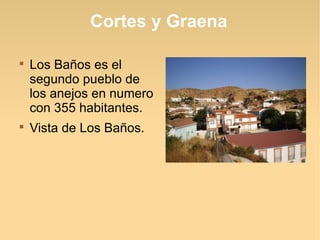 El documento describe los pueblos de Graena, Los Baños, Lopera y Cortes. Graena es el pueblo más grande con 1083 habitantes y ofrece una vista de la Sierra Nevada. Los Baños es el segundo pueblo más grande con 355 habitantes y es famoso por su balneario de aguas termales.