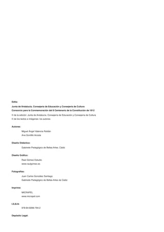 El documento proporciona información sobre el Monumento a las Cortes, Constitución y Sitio de Cádiz de 1812. Explica que el monumento conmemora los importantes eventos históricos que ocurrieron en Cádiz a principios del siglo XIX, incluyendo las sesiones de las Cortes y la elaboración de la Constitución española de 1812. También describe que el monumento fue construido entre 1912 y 1929 siguiendo el diseño del arquitecto Modesto López Otero y el escultor Aniceto Marinas