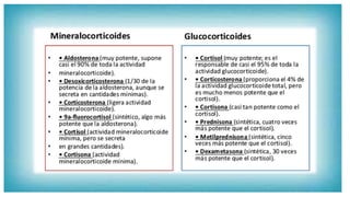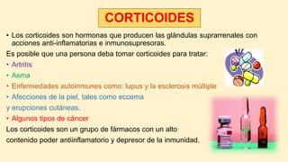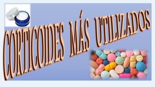 Este documento proporciona información sobre corticoides, incluyendo sus tipos, indicaciones, presentaciones farmacéuticas, vías de administración, efectos adversos y corticoides más utilizados como la dexametasona, prednisona, triamcinolona, betametasona e hidrocortisona. Explica que los corticoides son hormonas antiinflamatorias e inmunosupresoras producidas por las glándulas suprarrenales y se usan para tratar afecciones como artritis, asma y enfermedades autoin