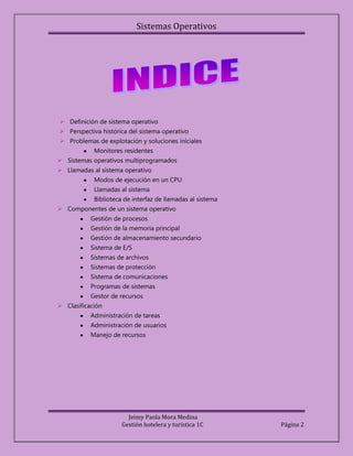 El documento define sistema operativo y describe su perspectiva histórica, desde los primeros sistemas operados manualmente hasta los modernos sistemas multiprogramados. Explica conceptos como procesos, gestión de memoria, E/S, archivos y protección. Clasifica los sistemas operativos en monotarea/multitarea y monousuario/multiusuario, y menciona ejemplos como Windows, Mac OS, Linux, Android e iOS.