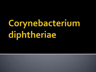 Este documento describe Corynebacterium diphtheriae, el agente causal de la difteria. C. diphtheriae es un bacilo gram positivo que produce una potente toxina que causa daño a distancia en órganos como el corazón y riñones. La difteria se caracteriza por la formación de membranas en la garganta y puede causar complicaciones graves e incluso la muerte si no se trata con antitoxina y antibióticos. La mejor forma de prevenirla es a través de la vacunación.