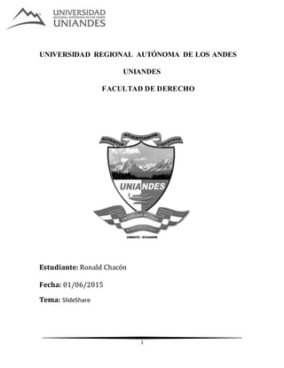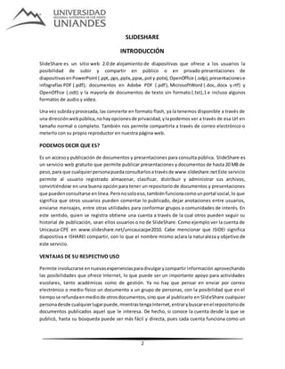 SlideShare es un sitio web que permite a los usuarios subir y compartir presentaciones y documentos en formatos como PowerPoint, PDF y Word. Los archivos se convierten a formato flash para que puedan verse en línea. SlideShare funciona como un repositorio público para que cualquier persona pueda buscar y ver documentos compartidos. También permite comentar y seguir las publicaciones de otros usuarios, actuando como una red social.