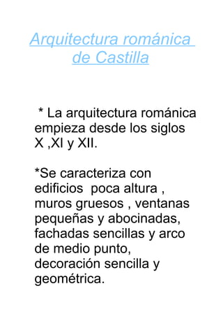 La arquitectura románica en Castilla se desarrolló entre los siglos X y XII, caracterizándose por edificios de poca altura con muros gruesos, ventanas y arcos de medio punto. Algunos ejemplos notables son la iglesia de San Martín construida entre los siglos XI y XIII con dos torres, y el monasterio de San Pedro de Arlanza cuyas ruinas aún permanecen.
