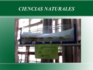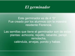 Este documento describe un germinador creado por estudiantes y su maestra con semillas de varias plantas como achicoria, repollo y habas. Incluye fotos del germinador unos días después de su construcción y luego de varias semanas, mostrando el crecimiento de las raíces, hojas y tallos. También contiene observaciones del desarrollo de las plantas después de un mes, así como información sobre otras actividades relacionadas con la huerta escolar.
