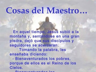 Jesús enseñaba a sus discípulos y seguidores las bienaventuranzas cuando Pedro, Andrés, Santiago, Felipe, Bartolomé y Juan comenzaron a hacer preguntas sobre exámenes, tareas y permisos en lugar de escuchar la lección. Un fariseo también interrogó a Jesús sobre su plan de estudios, atención a la diversidad y materiales de aprendizaje, lo que provocó que Jesús pidiera ser jubilado anticipadamente debido al desconcierto.