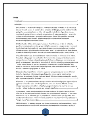 El documento describe diez herramientas tecnológicas que los docentes pueden utilizar para mejorar sus clases de forma dinámica e innovadora, incluyendo GoAnimate para crear videos animados, Pixton para cómics interactivos, y Edmodo como plataforma educativa. El uso creativo de estas herramientas permitirá una participación más activa de docentes y estudiantes durante el proceso de enseñanza-aprendizaje.