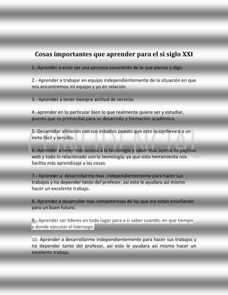 El documento presenta un resumen de las 10 cosas más importantes que un estudiante debe aprender para el siglo XXI según el maestro Lic. Gerardo Edgar Mata Ortiz. Estas incluyen aprender a ser consciente de los propios pensamientos y palabras, trabajar en equipo, desarrollar una actitud de servicio, enfocarse en lo que realmente desea estudiar, desarrollar afiliación con los estudios, aumentar el acceso a la tecnología, volverse más independiente para los trabajos, desarrollar más competencias para el futuro,