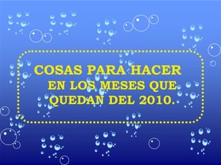 El documento lista varias cosas que se pueden hacer en los últimos meses de 2010, incluyendo practicar un deporte, aceptar nuevos desafíos, y cuidar la apariencia y la salud mental mediante actividades como aprender un idioma nuevo, reconciliarse con los demás, disfrutar de la naturaleza, soñar, y reír. El autor desea que el lector logre estos objetivos para terminar el año de manera positiva.