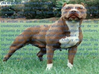 El documento discute si el pitbull es una raza o un tipo de perro. Explica que el pitbull es reconocido como una raza legítima por algunas organizaciones caninas aunque no por todas. Detalla las características físicas distintivas de la raza como su cabeza ancha y musculosa, cuerpo profundo pero no excesivamente voluminoso, y peso y altura variables pero típicamente en el rango de mediano. Además, enfatiza la importancia de mantener la buena salud del pitbull a través de revisiones veterinarias regulares y