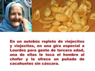 En un autobúsrepleto de viejecitos y viejecitas, en una gira especial a Lourdes para gente de tercera edad, una de ellas le toca el hombro al chofer y le ofrece un puñado de cacahuetes sin cáscara.