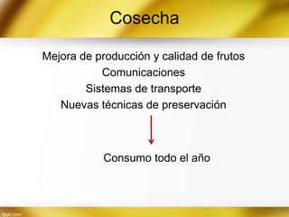 Este documento describe factores relacionados con la cosecha y el almacenamiento poscosecha de frutas. Detalla enfermedades patogénicas y desórdenes fisiológicos poscosecha comunes en diferentes frutas, así como técnicas de control como bajas temperaturas, modificación de la atmósfera y tratamientos químicos y hormonales. También cubre factores precosecha como la variedad, el patrón, las prácticas culturales y la nutrición, y la importancia de la recolección en el