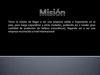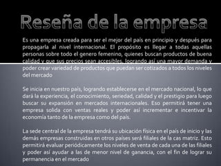 La empresa se crea inicialmente para ser líder en el mercado nacional de cosméticos en el país y luego expandirse internacionalmente. Su propósito es ofrecer productos de calidad a precios accesibles, especialmente para mujeres, para aumentar la demanda y crear una variedad de productos para todos los niveles de ingresos. La empresa se establecerá primero en el mercado local para ganar experiencia antes de expandirse a mercados internacionales. La sede central estará en el país de origen y las filiales en otros países reportarán a esta. La vis