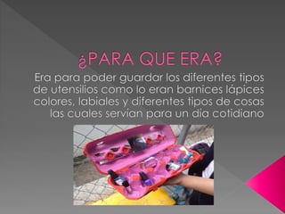 La persona describe cómo hizo una cosmetiquera casera usando una caja de huevos vacía que pintó de colores como rosa y morado. Adhirió un espejo a la caja para que pueda usarse al aplicar maquillaje y luego colocó artículos de belleza en el interior una vez que la pintura se secó.