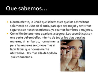 Los documentos discuten los cosméticos, incluyendo su definición, usos y posibles efectos en la salud. Se explica que los cosméticos se usan para mejorar la apariencia y la higiene corporal. También se mencionan ejemplos como lápiz labial, cremas para la piel y el cabello. Algunos puntos destacados son que los cosméticos pueden ser buenos o malos para la salud dependiendo de la persona y los ingredientes, y que hacer cosméticos caseros puede ser más económico y saludable que