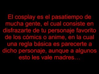 El documento presenta varios ejemplos de cosplays, donde personas intentaron disfrazarse de personajes populares de cómics y videojuegos pero tuvieron resultados poco exitosos o ridículos. Describe brevemente cada intento fallido de cosplay, señalando las similitudes y diferencias entre la persona y el personaje que intentaron representar. Al final, incluye dos fotos de personas vestidas casualmente que se parecen accidentalmente a personajes de Dragon Ball.