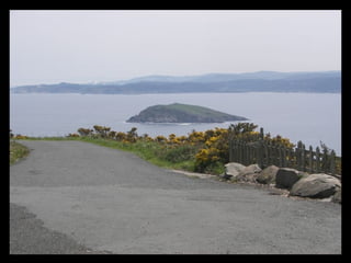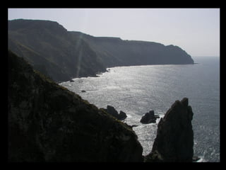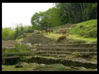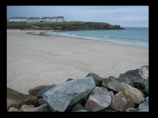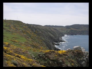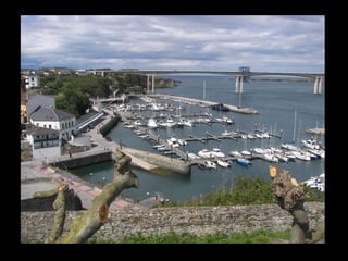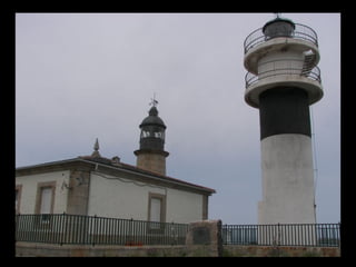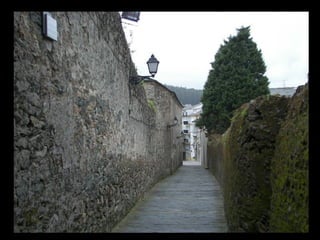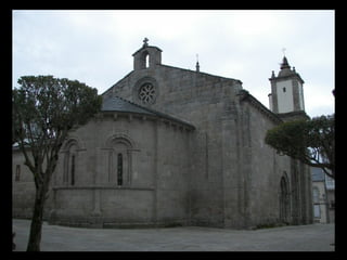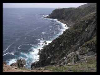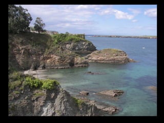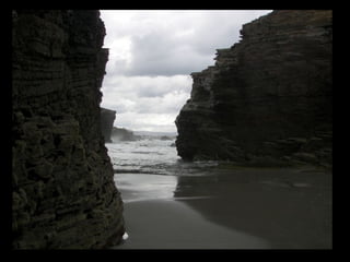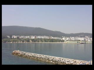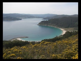 Este documento proporciona una lista de lugares a lo largo de la costa gallega en España, incluyendo playas como Playa de las Catedrales, así como sitios históricos como la Basílica de S. Martiño de Mondoñedo y Cabo Ortegal. La lista comienza en Ribadeo y termina en Finisterre, recorriendo diversas localidades a lo largo de la costa noroeste de Galicia.