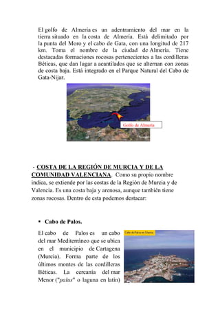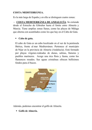 La costa mediterránea española se divide en cuatro zonas principales: la costa andaluza, la costa de Murcia y la Comunidad Valenciana, el golfo de Valencia y la costa catalana. Algunas características notables incluyen el cabo de Gata en Almería, conocido por sus playas vírgenes y flamencos, el cabo de Palos en Murcia con numerosas calas, y el cabo de Creus y el golfo de Rosas en Cataluña, ambos con costas rocosas.