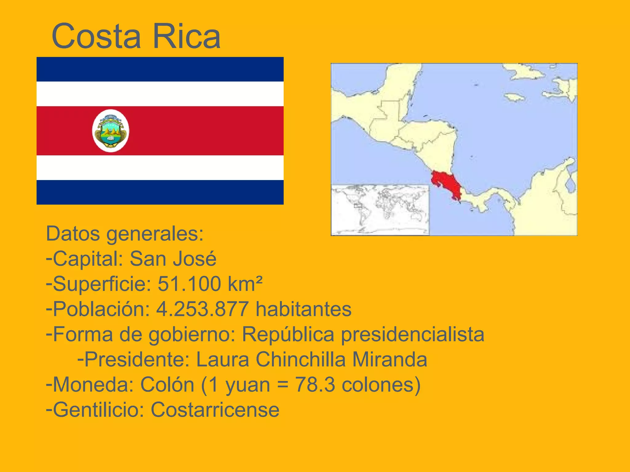 Costa Rica es una república presidencialista ubicada en Centroamérica. Tiene una superficie de 51,100 km2 y una población de 4.25 millones de habitantes. La capital y ciudad más grande es San José. Algunas ciudades importantes incluyen Cartago, Puntarenas y Puerto Limón. Costa Rica exporta productos agrícolas como plátanos, café, cacao y azúcar. Puntos de interés notables son el volcán Arenal, el Parque Nacional Corcovado y el Museo del Jade.