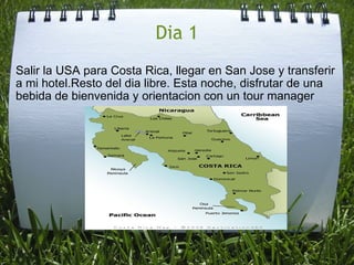 El documento describe un viaje de 6 días a Costa Rica. El primer día llega a San José y se traslada al hotel. El segundo día visita el volcán Arenal y el lago. El tercer día explora el área de Arenal. El cuarto día viaja a Monteverde y visita una cooperativa de artesanos. El quinto día explora el bosque nuboso de Monteverde rico en biodiversidad. El sexto día regresa al aeropuerto para el vuelo de salida.