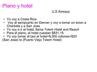 El documento describe un viaje de 6 días a Costa Rica. Incluye detalles sobre el vuelo a San José, la reserva de un hotel llamado Totem Hotel and Resort por $831.15, y actividades planeadas como ir a la playa, visitar el Parque Nacional Cahuita, montar a caballo, explorar la selva lluviosa, ir al mercado en Puerto Viejo y regresar a casa.