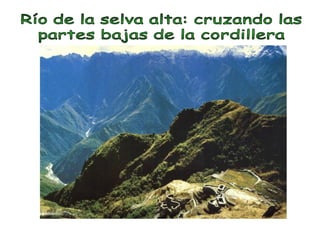 Este documento describe las tres regiones geográficas del Perú - la Costa, la Sierra y la Selva. La Costa se encuentra junto al Océano Pacífico y tiene un clima templado. La Sierra está conformada por la Cordillera de los Andes y tiene un terreno accidentado con montañas, volcanes y valles. La Selva se divide en Selva Alta y Selva Baja, y tiene un clima cálido y húmedo con abundantes ríos y vegetación.